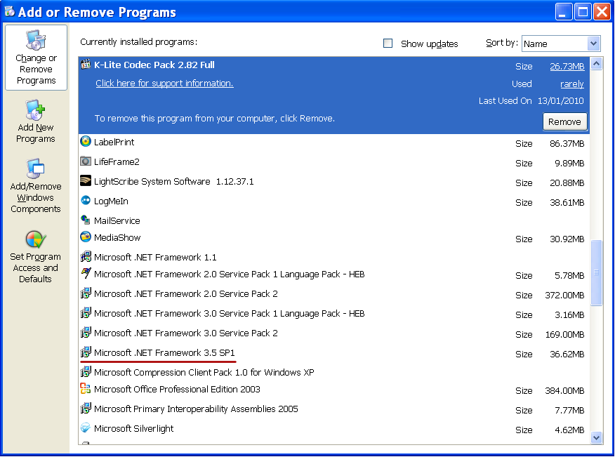 ** Если Ваша операционная система – Windows XP, то для того, чтоб узнать какая версия .NET Framework установлена на Вашем компьютере надо зайти в Control Panel -> Add or Remove Programs. В появившемся списке надо найти соответствующую запись, как показано на картинке ниже. Если таковой не окажется, то надо устанавливать.